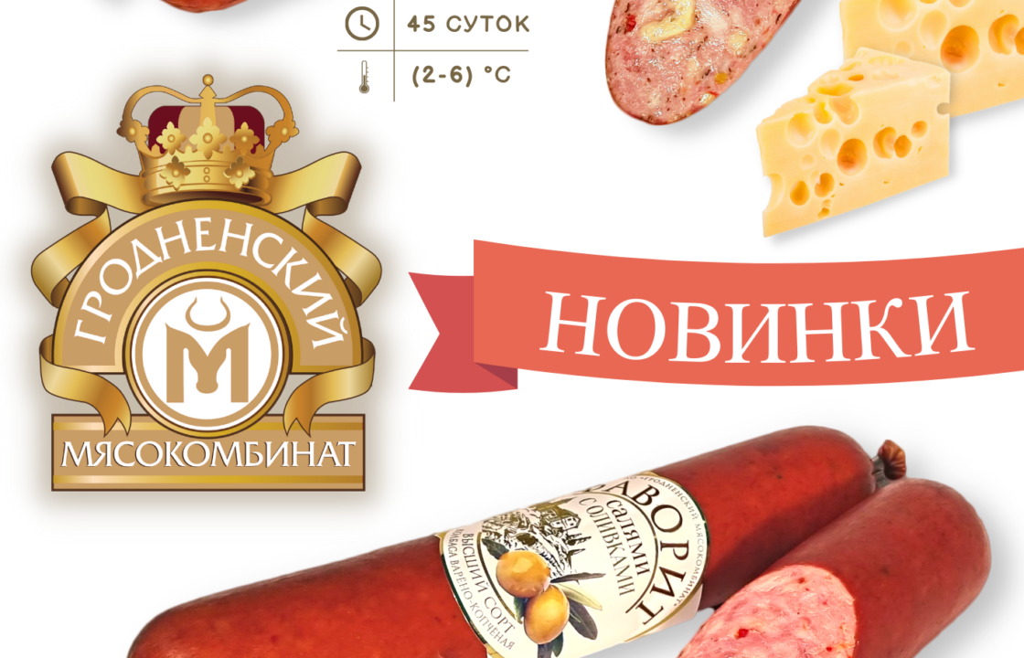 Яркие новинки от Гродненского мясокомбината! -Колбаса Фаворит с оливками -Колбаса Фаворит с сыром Варено-копченые колбасы с утонченным Итальянским вкусом!