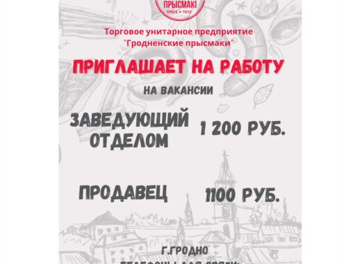 Торговая сеть Гродненские прысмаки расширяется. Ищем продавцов и заведующих отделом. Заведующий отделом от 1200руб Продавец от 1100руб В команде нашей фирменной сети существует большое количество корпоративных бонусов: 👇 🤩 премия к религиозным праздникам и праздничным датам; 🤩 материальная помощь к отпуску; 🤩премирование по итогам работы; 🤩13-я зарплата; 🤩санаторно-курортное лечение 🤩 детские путевки в оздоровительные лагеря; 🤩 медицинская страховка за счет организации; 🤩 туристические поездки от профсоюза организации; И это лишь малая …